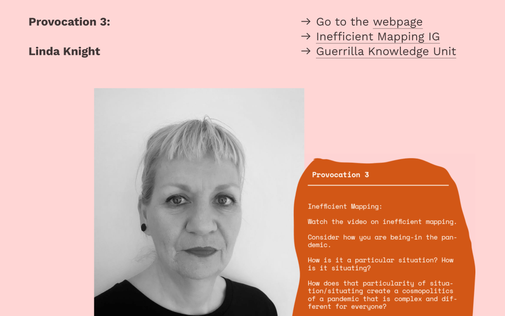I was invited to submit a provocation that encourages critical thinking about being-in the pandemic, and how that is both a situation and a situating. I ask that you consider the politics of being-in a pandemic and that you inefficiently map this situating/situation to create a cosmopolitical rendering of the pandemic.