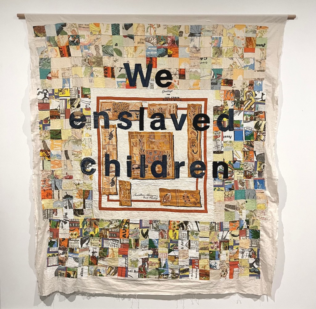 Cloaking Quilting Reckoning: We Enslaved Children. 2022-2023. 180 x 186 cm. Textile and wood Dowling. Artist: Linda Knight.