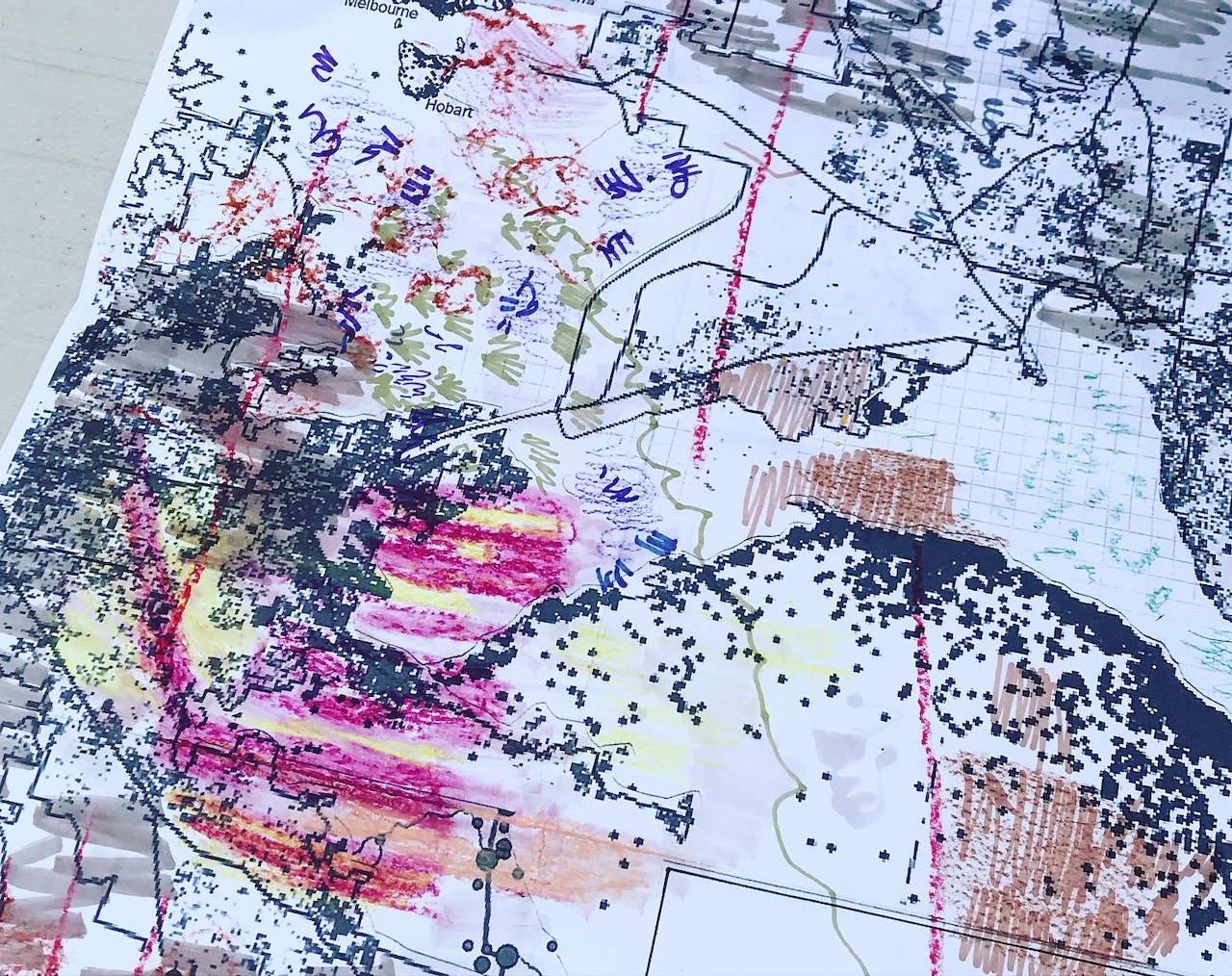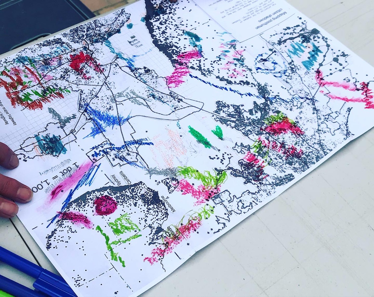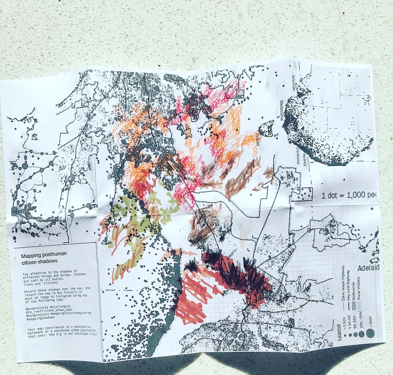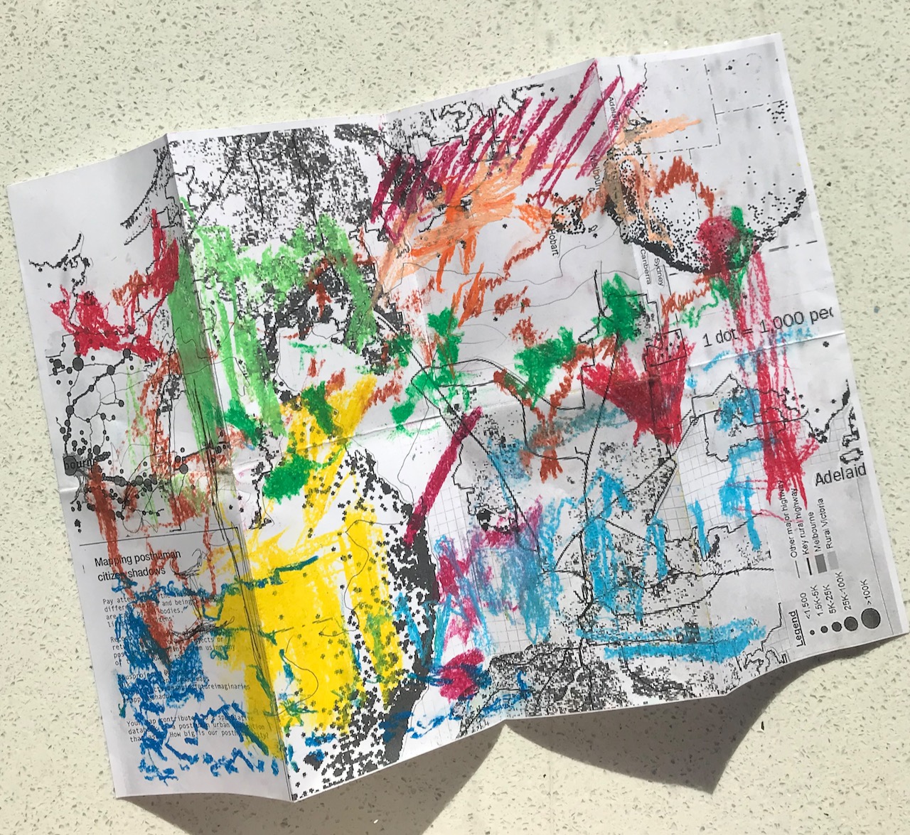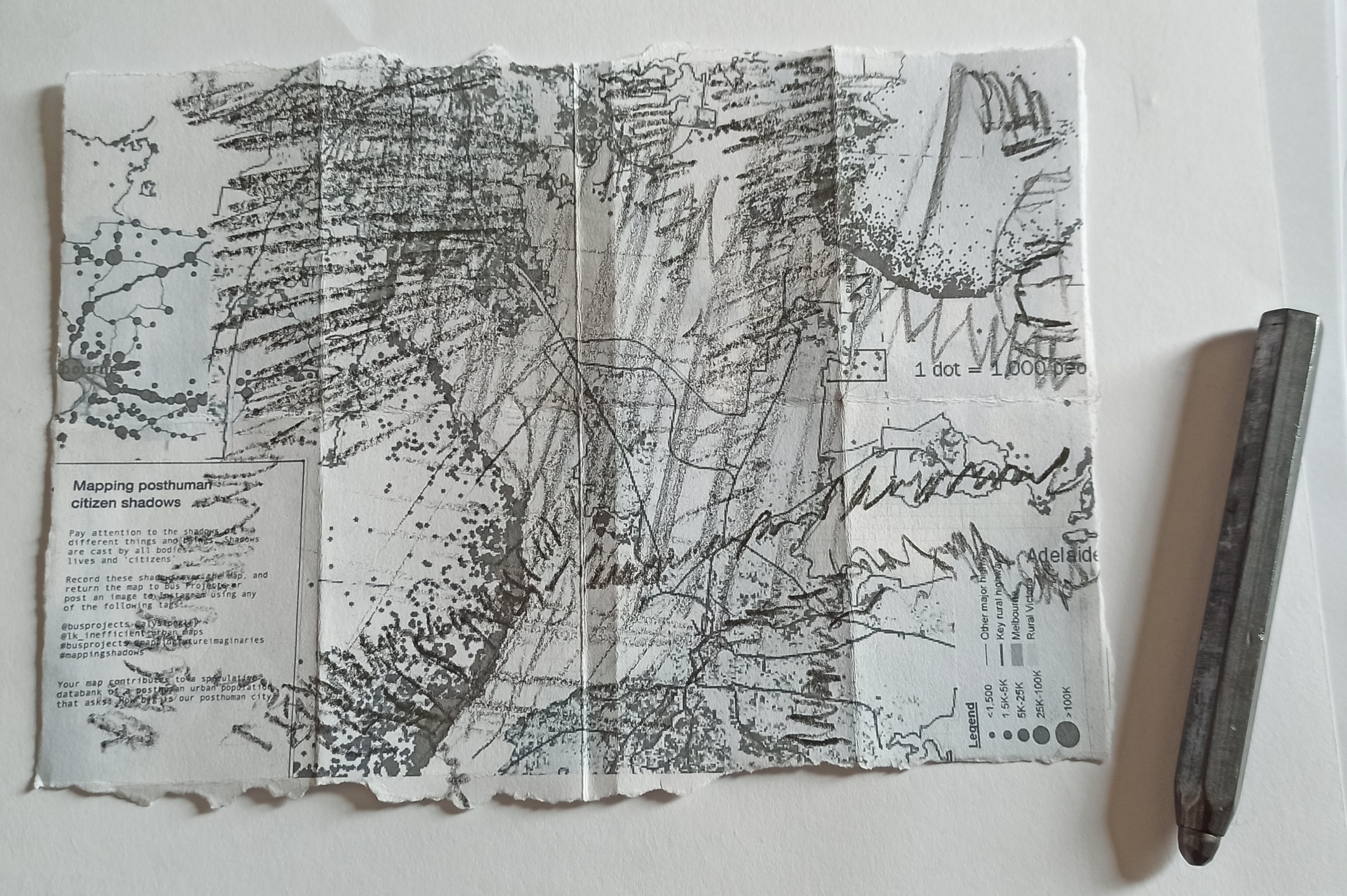 - Take the paper or digital map, and using any drawing tool of your choice, record the shadows of your chosen citizen on the printed side of the map. You can use any medium and any colour/s.