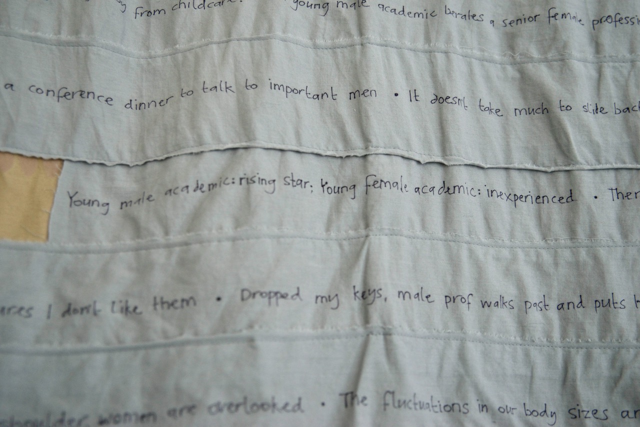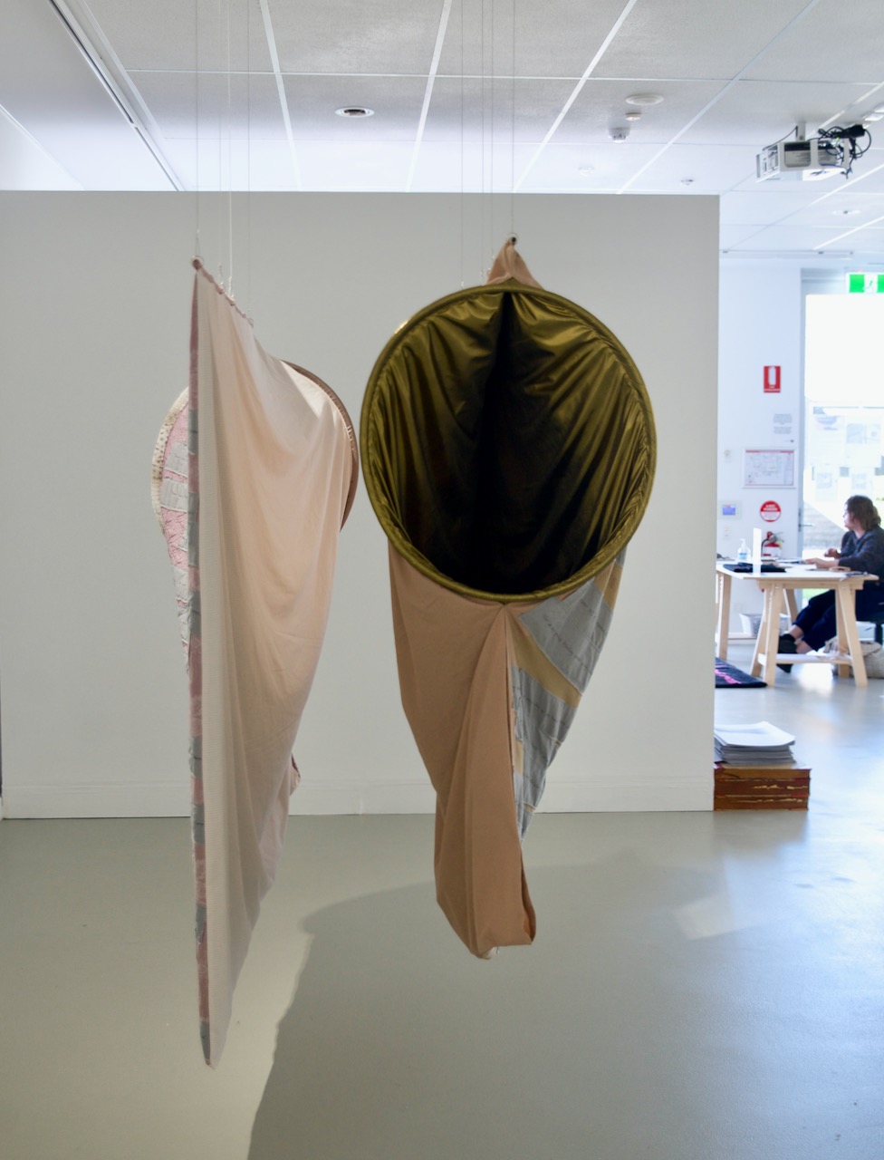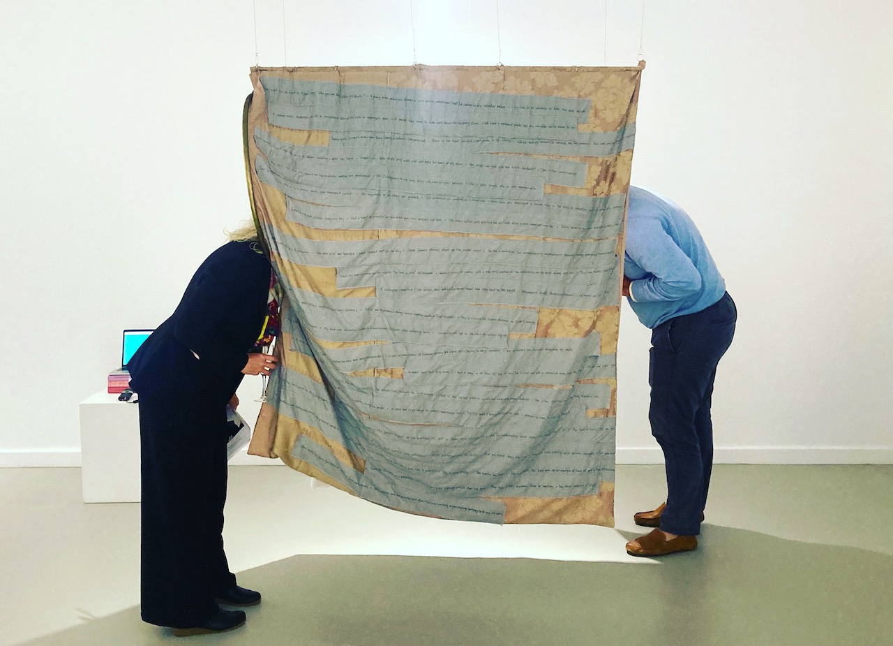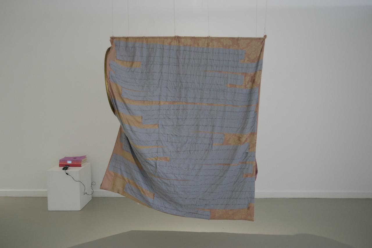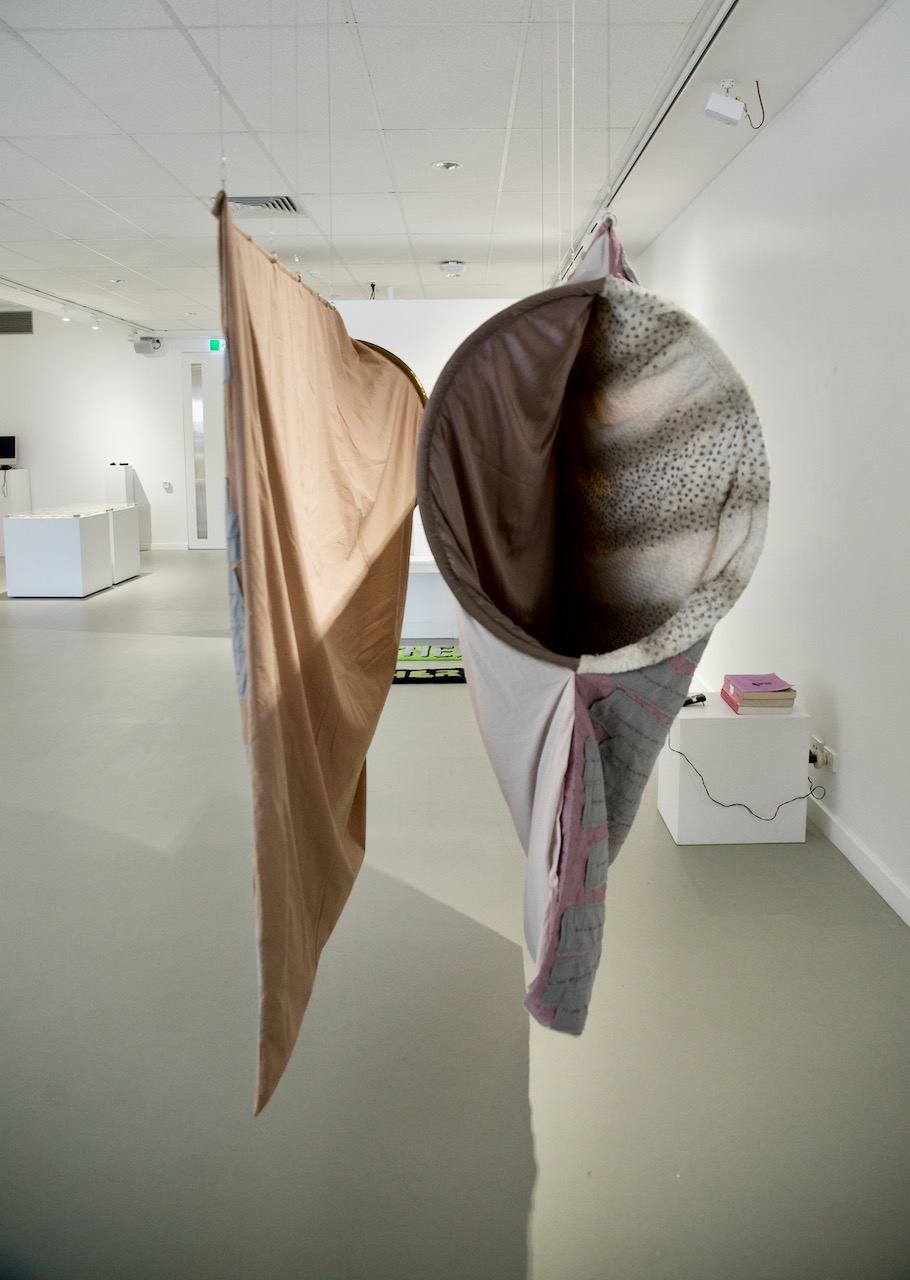 In There There, two large, quilt-like pockets offer an immersive escape from everyday sexism. Their round openings are an enticing invitation to climb in and rest, to regain resilience and replenish self-belief. The dark spaces are not exactly a space of solitude however, as they are filled with the cheering sounds of audiences, and calming but empty motivational affirmations.