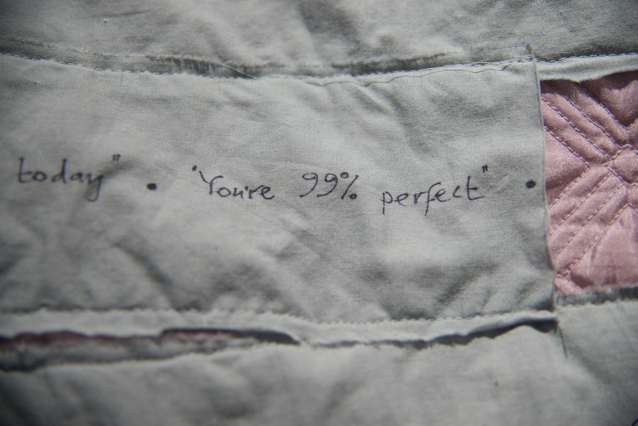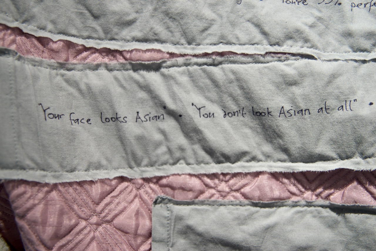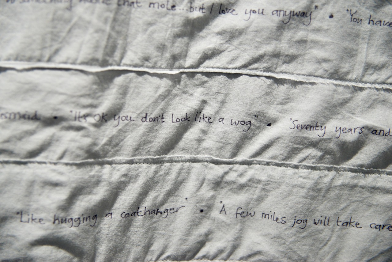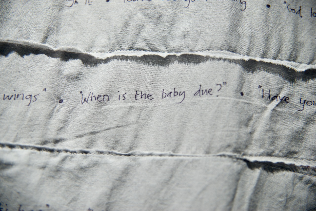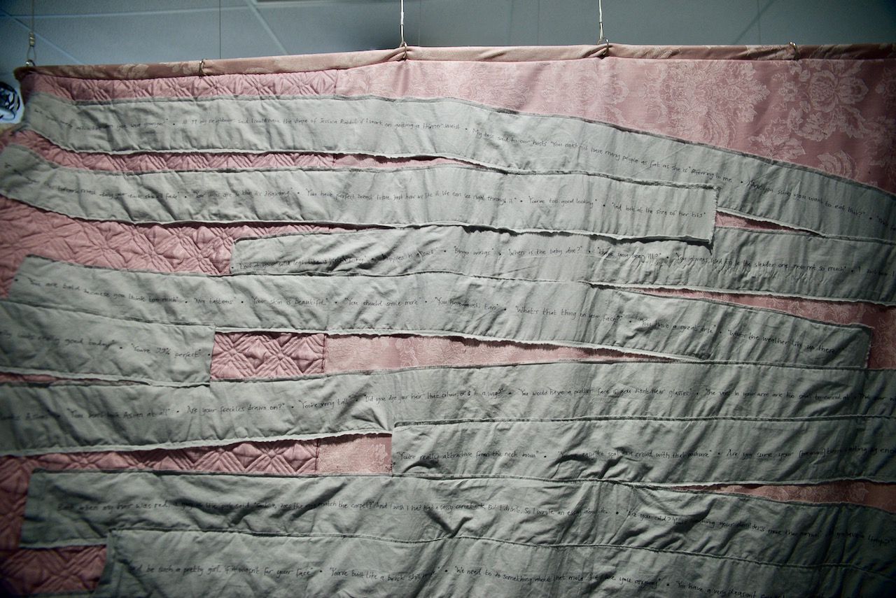 In There There, two large, quilt-like pockets offer an immersive escape from everyday sexism. Their round openings are an enticing invitation to climb in and rest, to regain resilience and replenish self-belief. The dark spaces are not exactly a space of solitude however, as they are filled with the cheering sounds of audiences, and calming but empty motivational affirmations.